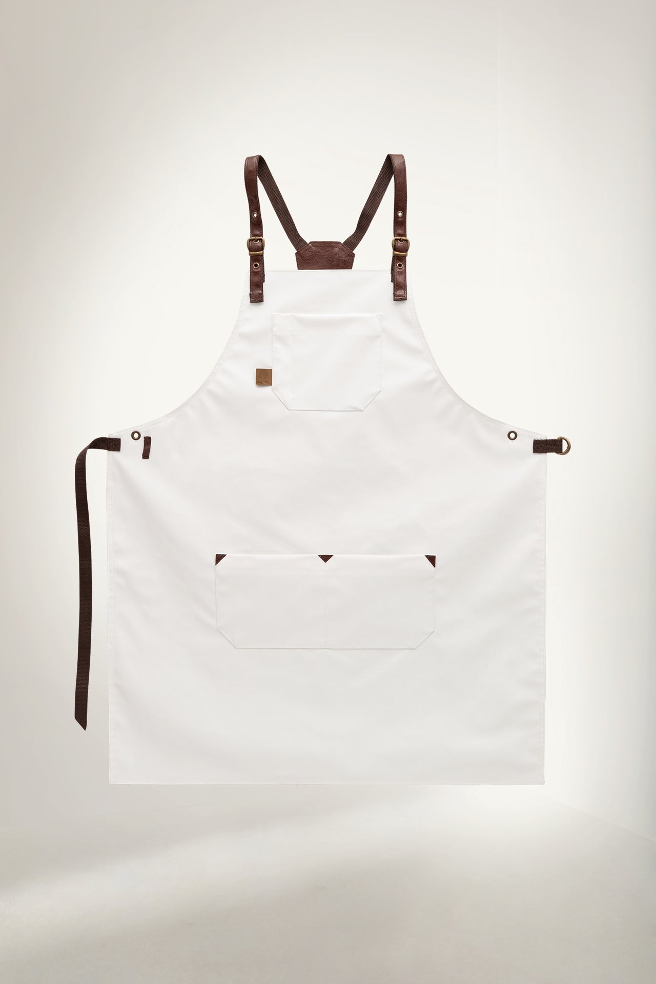 Elevate your workspace with the Albino apron in premium white leatherette. This sophisticated apron combines clean, minimalist aesthetics with professional-grade functionality. The contrast of pristine white leatherette and rich brown leather straps creates a refined look that stands out in any setting.