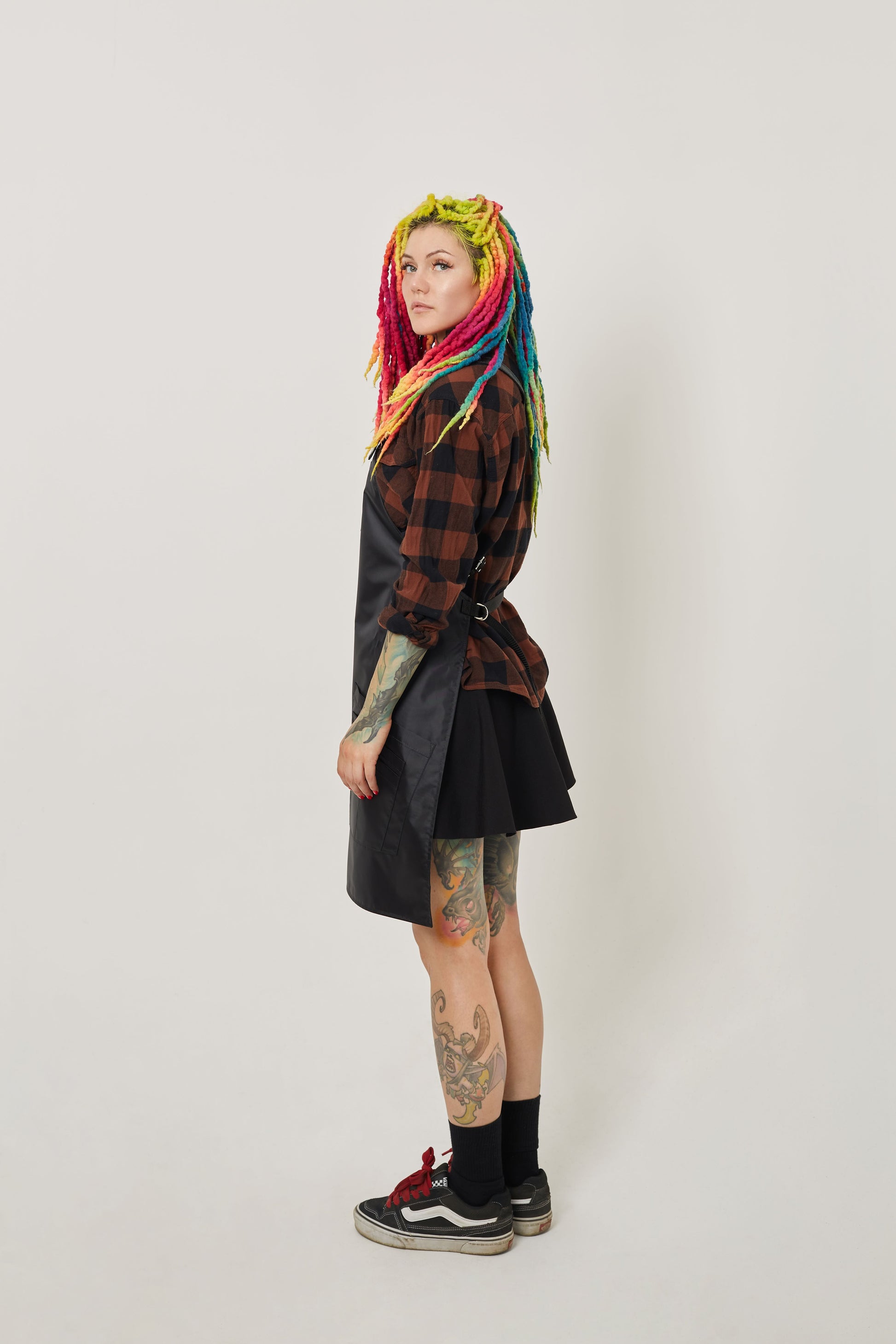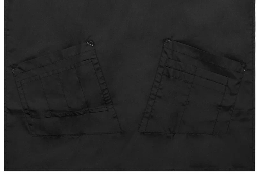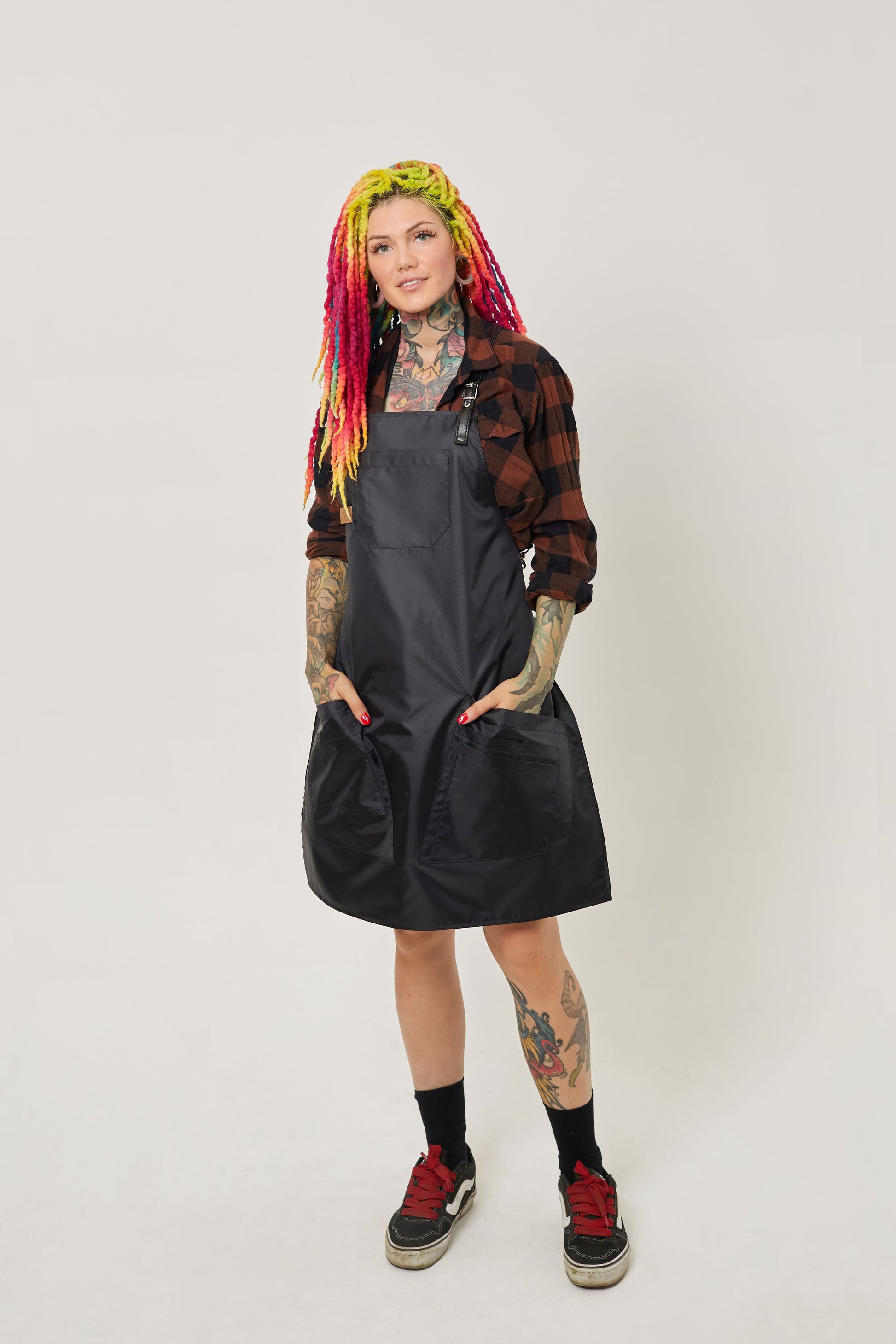The Coiffeur is our raincoat fabric apron—specifically designed for barbers and makeup artists who need maximum tool storage and water-resistant protection. Crafted from durable raincoat fabric with a zippered chest pocket and two large front pockets, this apron keeps all your tools, brushes, and essentials organized and accessible. Available in sleek black.
