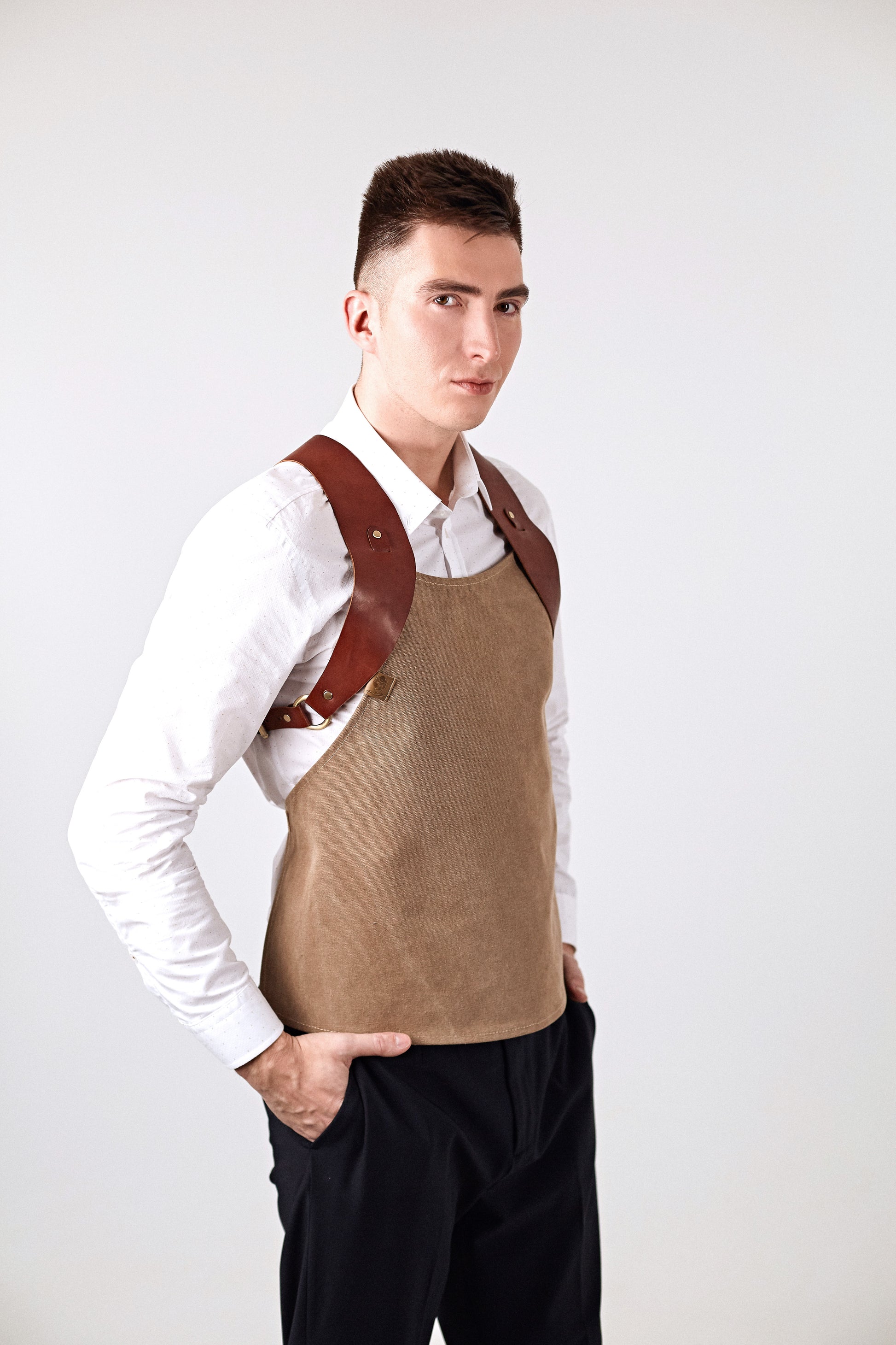 Meet the Ambassador, the flagship of our collection. Created for professionals who arrive ready to impress but aren't afraid to roll up their sleeves and get to work. The heavy-duty canvas body protects you from spills and splashes, while the striking genuine leather harness commands attention and respect.