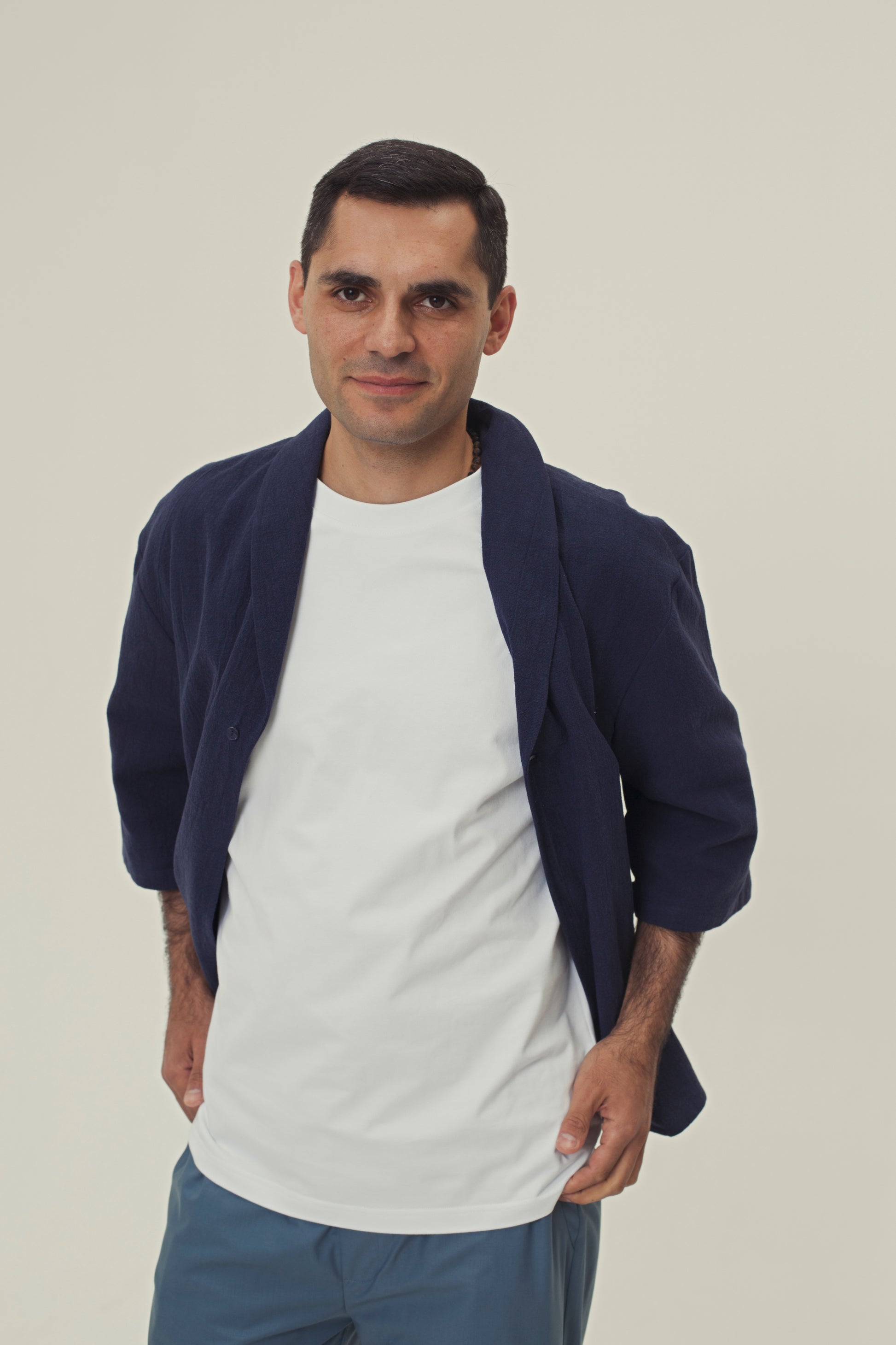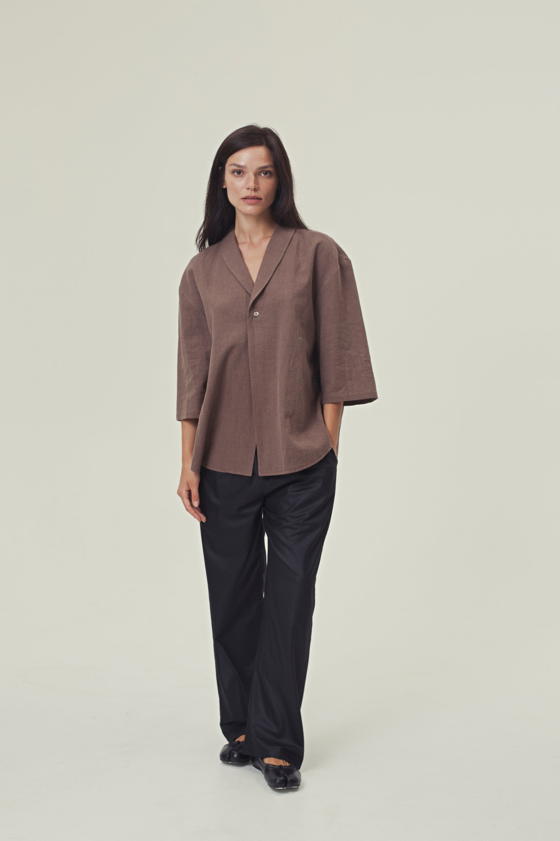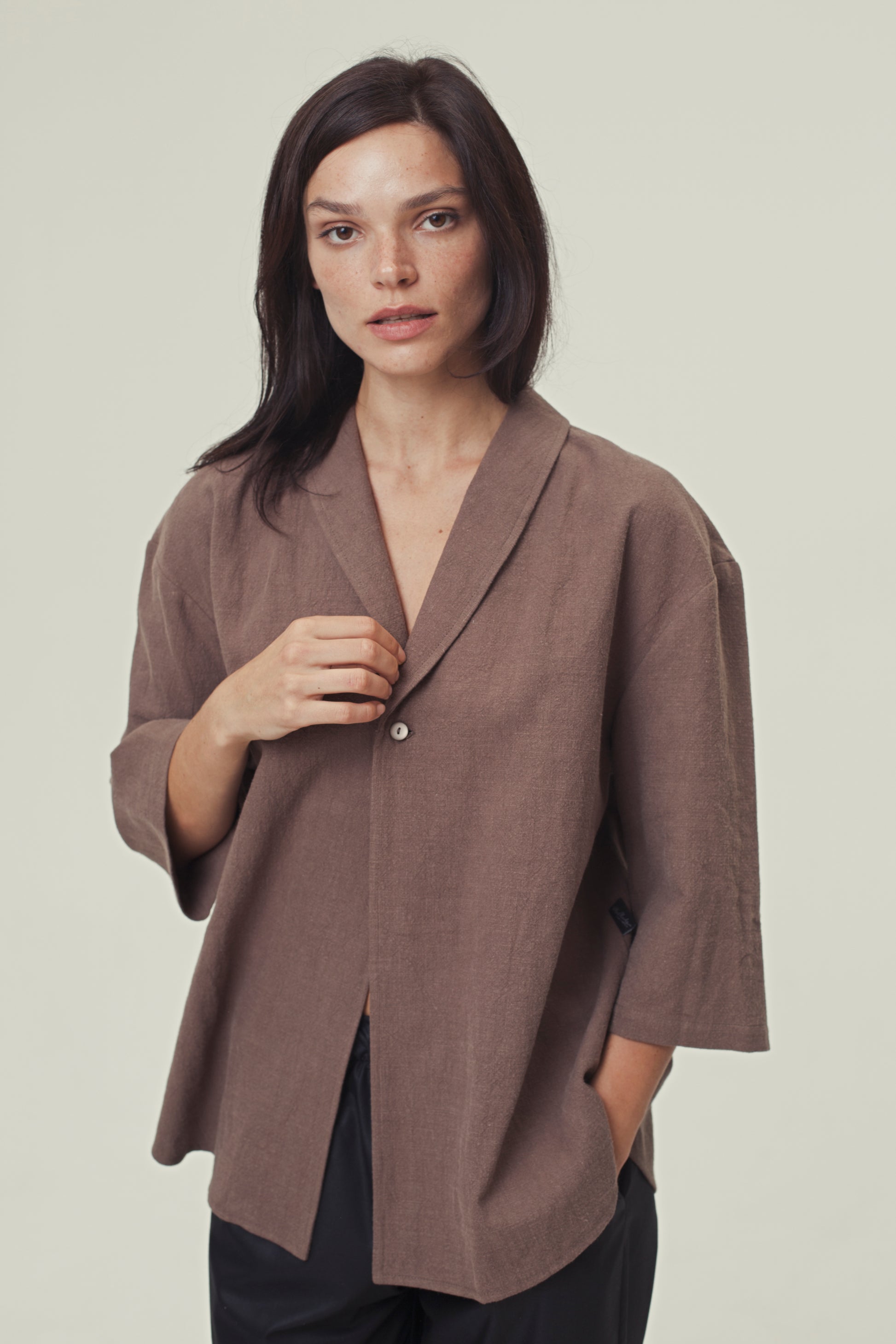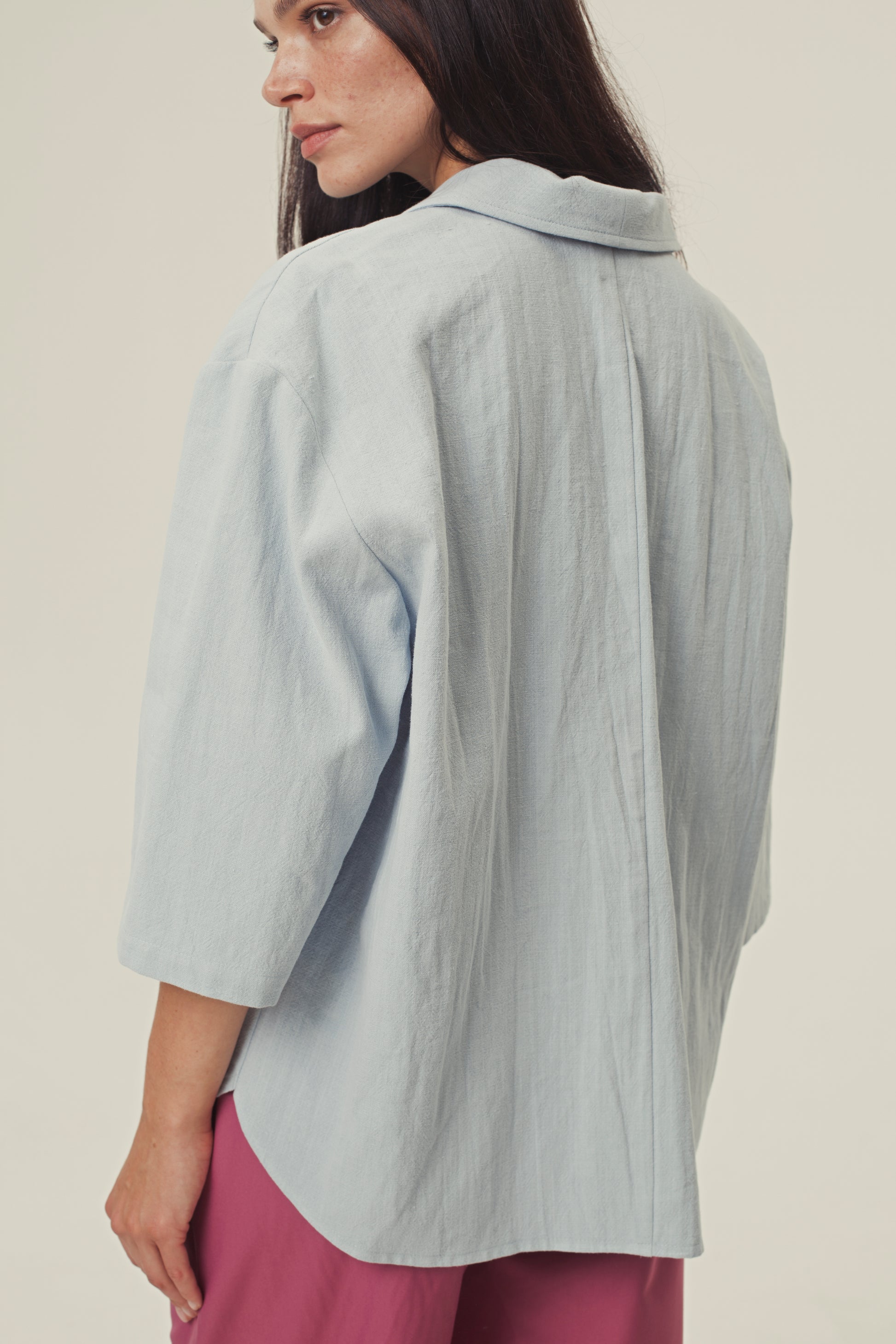 Specs: 100% natural nettle fabric | 240-250 g/m² density | Relaxed oversized fit | Notched collar | Three-quarter sleeves | Single button closure | Available in 3 colors