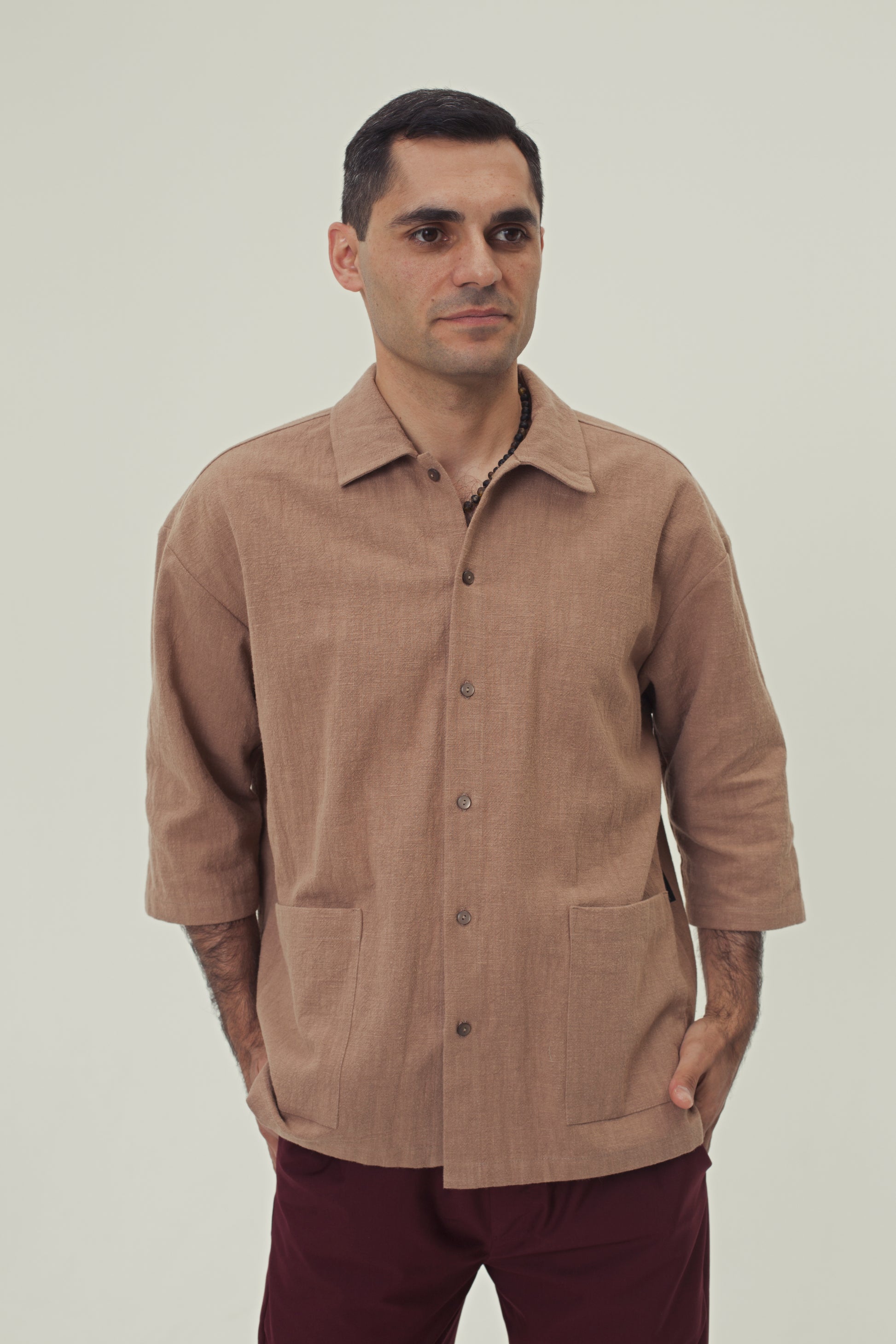 Specs: 100% natural nettle fabric | 240-250 g/m² density | Three-quarter length sleeves | Classic collar | Chest and side pockets | Available in 4 colors